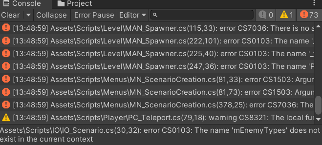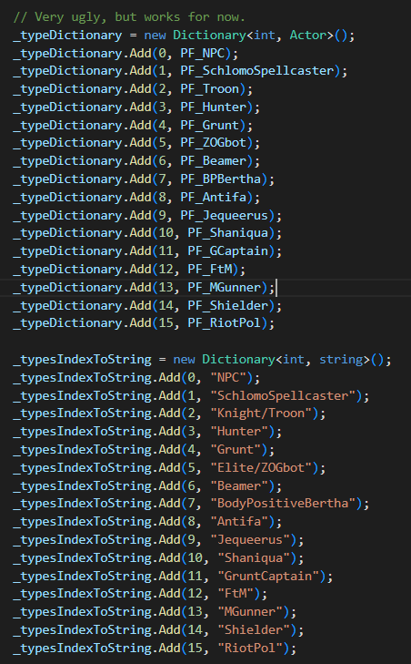 More importantly, the code for spawning in new enemies was both complicated and fragile. One part of this system required me to manually hardcode the nicknames of various enemy types into one dictionary, then cross-reference this with a second dictionary that stored prefabs. I had to remember the order of the entries in the first dictionary to read them out of the second, as well as remembering what I called these enemies in the save file, which was different than the prefab name. One wrong character in the string and nothing would spawn.