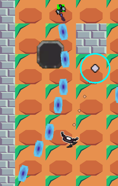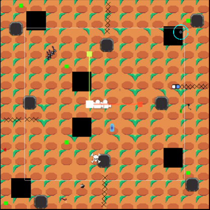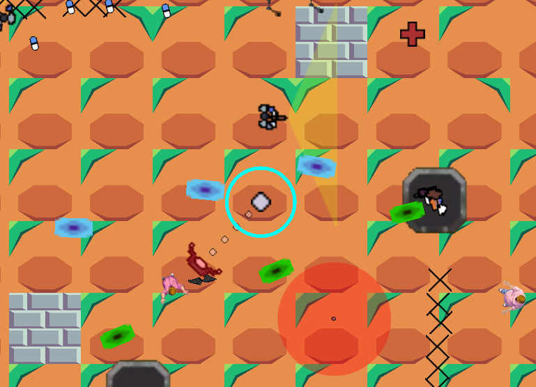 One of the most degenerate strategies in the game is mindless circle strafing. I have largely eradicated that through crude methods, but I figured that if I eased up on those solutions, the militarized police would appear intelligent by waiting in places that punish the player for circling around the outside of the arena, while also being next to something that blocks projectiles. The best spots for this are marked with the small green squares in the image below.
