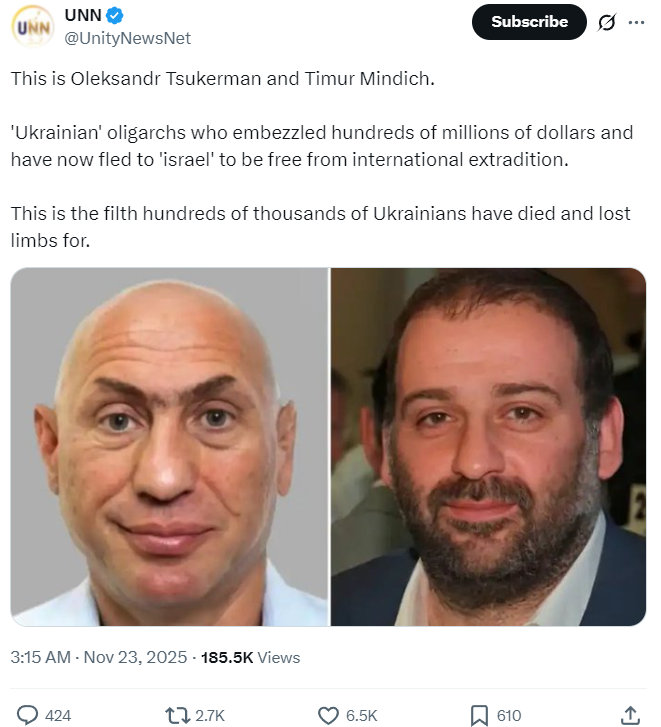 As Ukrainian Goyim deal with blackouts, Zelensky’s buddies flee to Israel with, bare minimum, $100 million that they stole from taxpayer money meant to protect energy infrastructure. Although they’re making sure that not all Ukrainians are cold this winter.