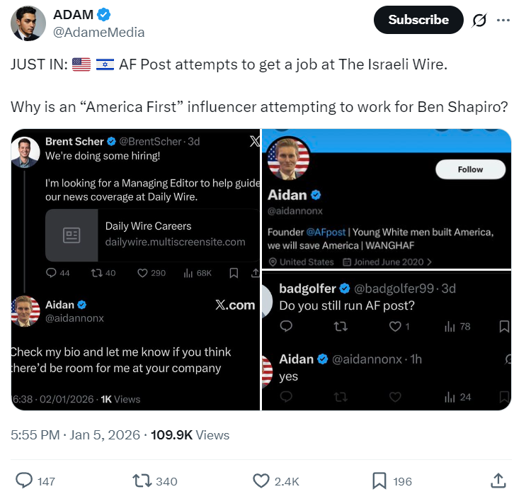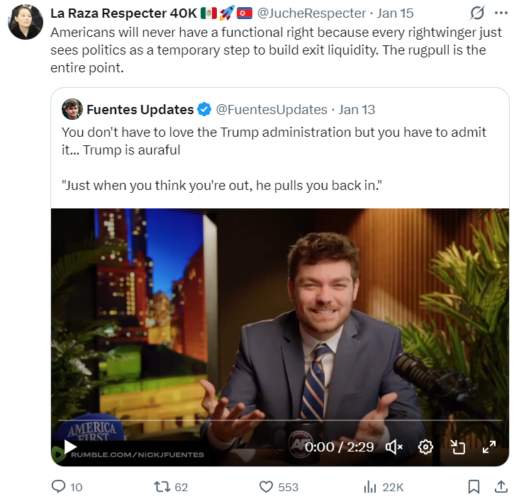 I have seen so many of these characters build up an audience rehashing basic bitch WN talking points before “ironically” supporting ZOG when it matters most. Hell, I’ve seen Fuentes himself do this multiple times now. He views his audience as an asset to build up and then sell to ZOG and he’s cycled through a few batches at this point.