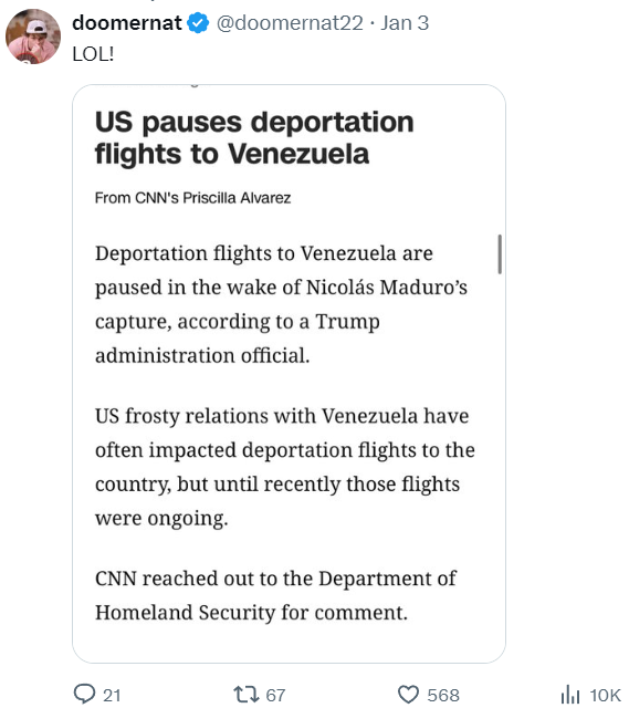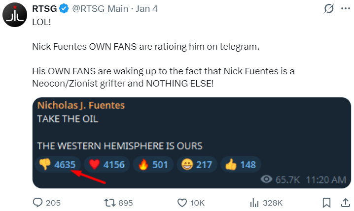 Fuentes’ fans are a bunch of drooling retards, but apparently even they were downvoting his full throated defense of Trump’s Venezuela intervention. Hinkle shows many examples in his video, below is another I found floating in the ether.