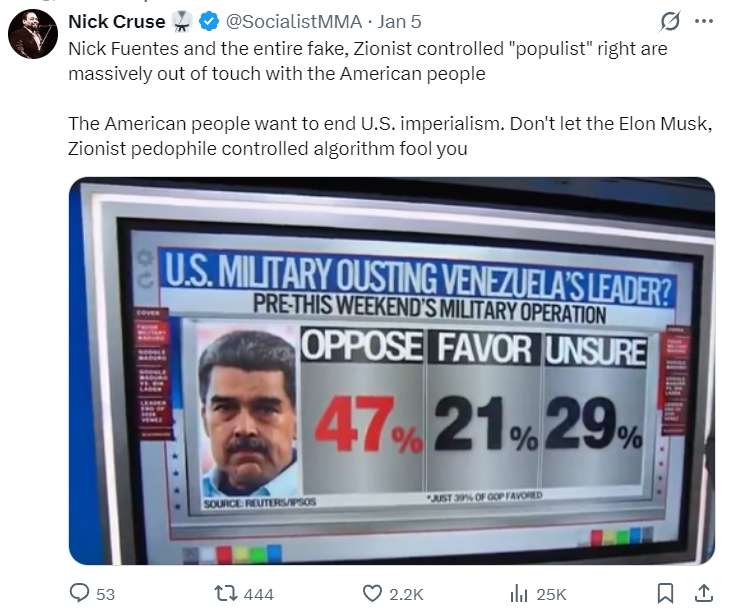 It’s surprising that the Fuentes tards are revolting, but it’s also true that there really is no constituency left for ZOGs foreign policy, especially not among young people who are presumably the majority of Fuentes’ (botted) audience.