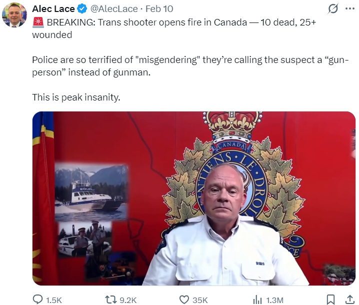 In order to not hurt the feelings of the trans-community the brave, Zionist RCMP has referred to the shooter Jesse Strang, who went by “Jesse Van Rootselaar,” as a “Gun-Person.”