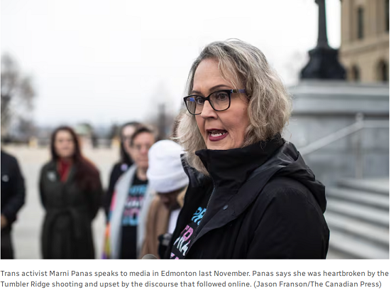 Marni Panas, a trans activist based in Edmonton, says her heart broke when she saw news of Tuesday’s mass shooting in Tumbler Ridge, B.C., that left nine people dead, including the suspect, and 27 injured.