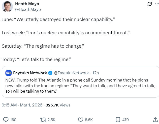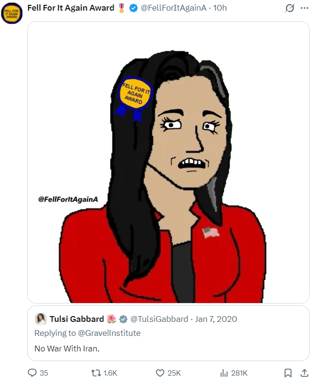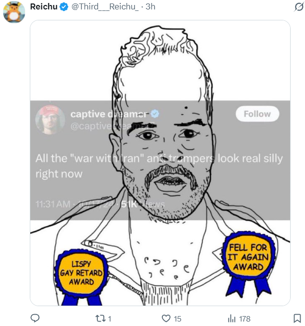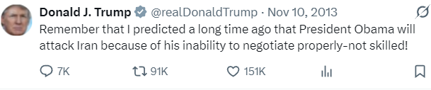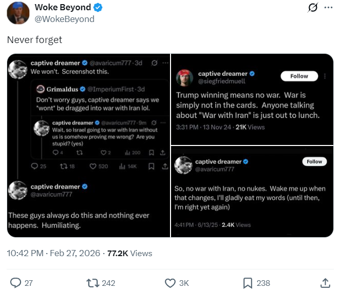 I’m so far removed from caring about what e-rightoids say that I didn’t want to even include this, but it is worth reminding people that, when Trump chickened out of continuing the attack on Iran six months ago, the ZOGshills were calling us histrionic blah blah Trump’s not going to go back in blah blah.