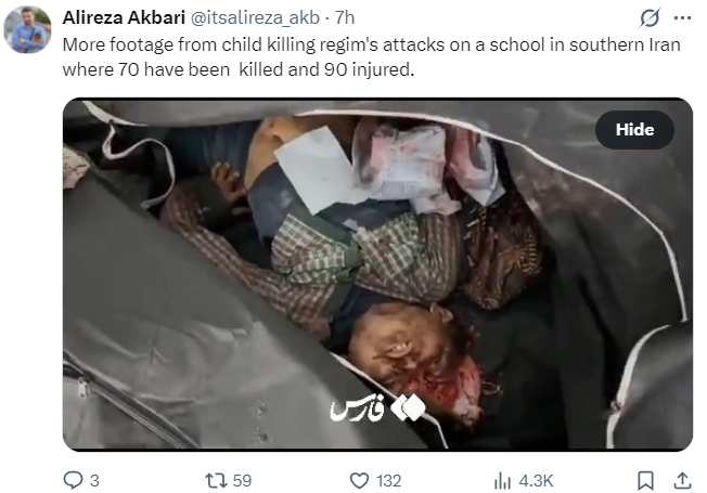 The process of rebuilding that Reza Pahlavi called for will have to start with the elementary schools, since Israel accidentally-on-purpose-targeted them first with humanitarian missiles of human rights freedom democracy.