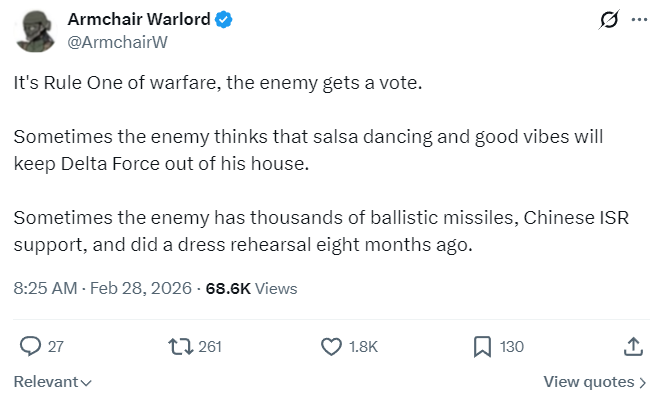 On the other hand, real life is not Star Wars, where killing the enemy leader instantaneously deactivates the clone army. Iran’s response, all of which occurred after the assassination of Khomenei, has already got Trump whining for a ceasefire, which they have rejected.