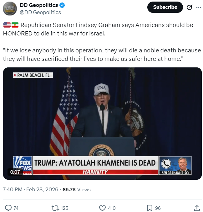 Ladybug Lindsay Graham echoes Trump’s sentiment about you dying, and would like to remind you that it is good and honourable to die for Israel.