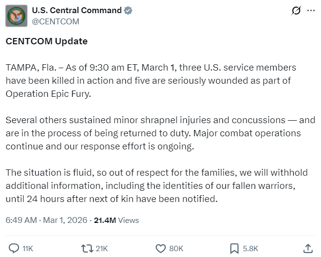 Which is good, as this morning Centcom announced that three US servicemen have already been killed, along with five others seriously wounded.