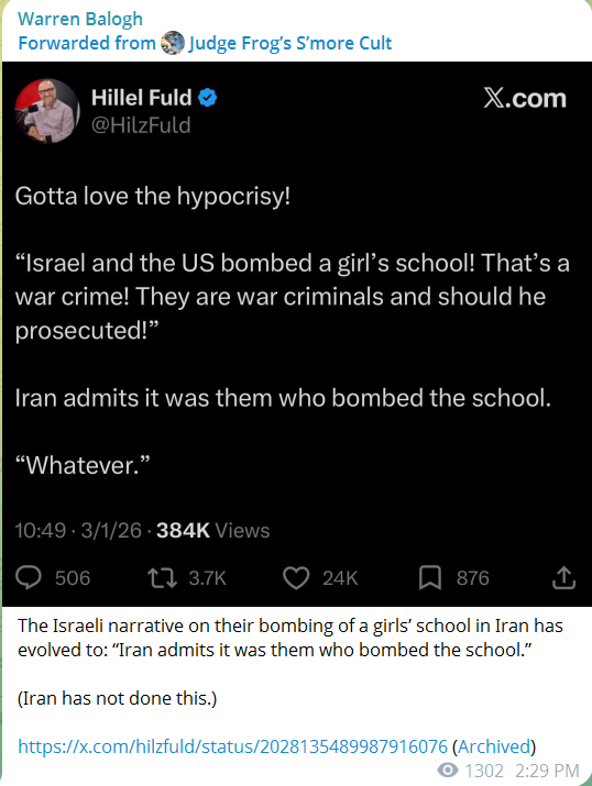 Israel didn’t even bother to pretend this was an accident, although a few zionist disinformers pretended that Iran admitted to targeting the girls school themselves. This is obviously something that never happened, but the point is to shit up the conversation, thus preventing Jews from having to defend their decision to deliberately murder children, again. After all, these are the the same people who targeted over 200 schools in Gaza.