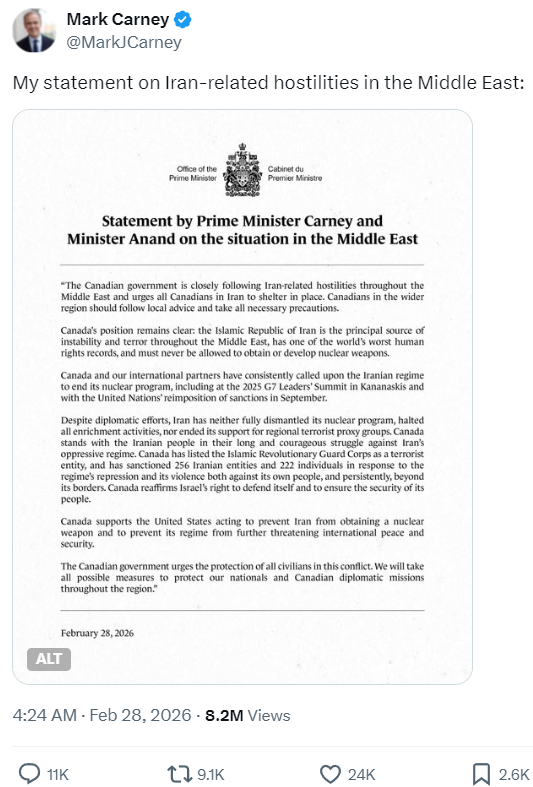 “Canada supports the United States acting to prevent Iran from obtaining a nuclear weapon and to prevent its regime from further threatening international peace and security,” Carney said, affirming also that Canada supports Israel’s right to defend itself against threats from Iran.