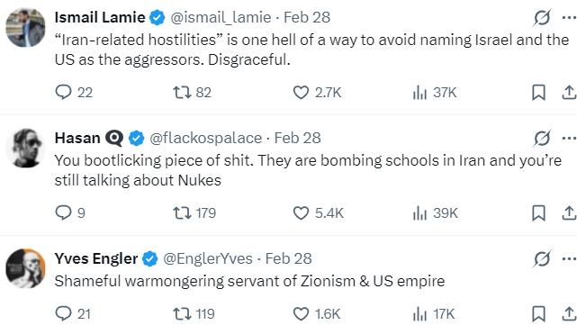 It’s barely worth responding to, but it was obviously a military accident that Iran downed a flight full of their own citizens, and the claim they intentionally murdered a bunch of their own people in order to vaguely terrorize Israel or whatever is a blatant slander that exists to justify Israel murdering their children, like they just did. Oh, and by the way, both of these Israeli lapdogs, Poilievre and Carney, made these statements after the girls were killed.