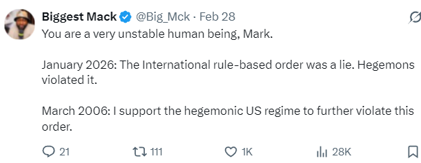Speaking of those treasonous parasites, how’s Mark Carney doing? I keep getting told by rightoids that the butthole-left supports Muh Third World and Muh Islamists. Justin Trudeau bravely broke from that trend by deepthroating circumsized settler penis at every opportunity, but last month Mark Carney mumbled his way through a speech denouncing the (fake) rules based order, so surely –