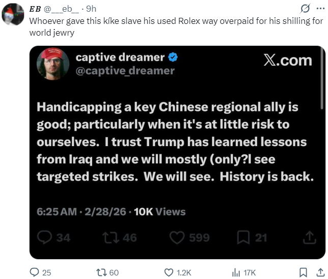 I’m so far removed from caring about what e-rightoids say that I didn’t want to even include this, but it is worth reminding people that, when Trump chickened out of continuing the attack on Iran six months ago, the ZOGshills were calling us histrionic blah blah Trump’s not going to go back in blah blah.