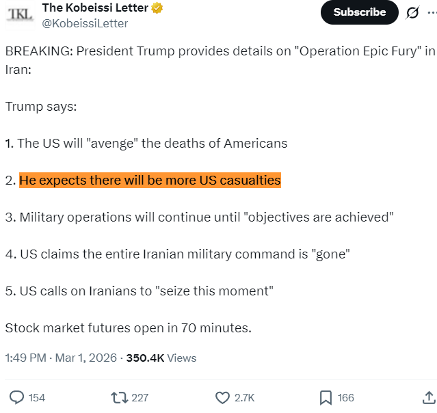 On the other hand, real life is not Star Wars, where killing the enemy leader instantaneously deactivates the clone army. Iran’s response, all of which occurred after the assassination of Khomenei, has already got Trump whining for a ceasefire, which they have rejected.