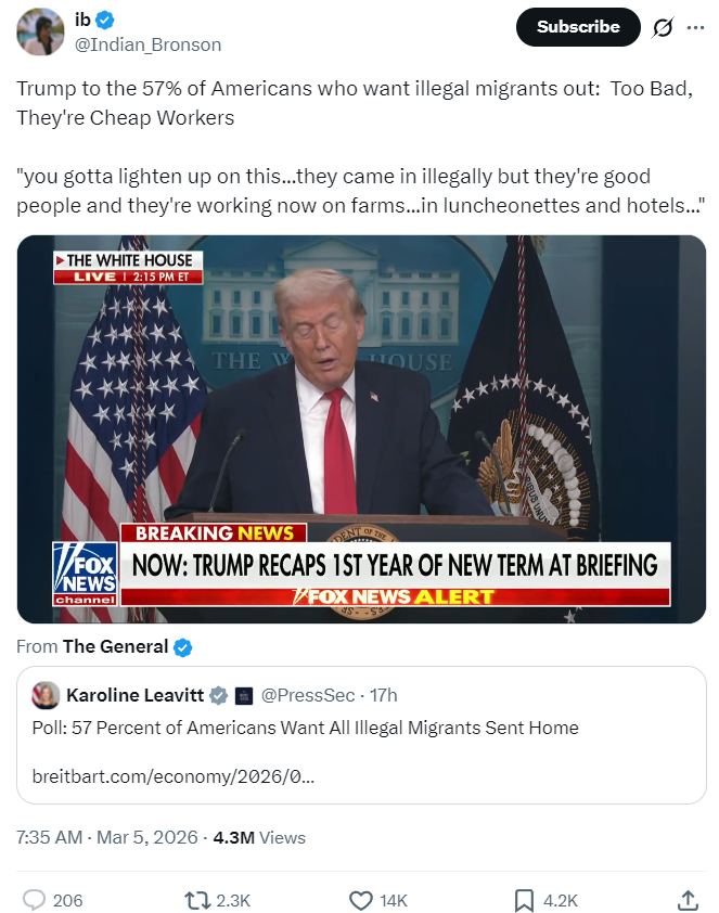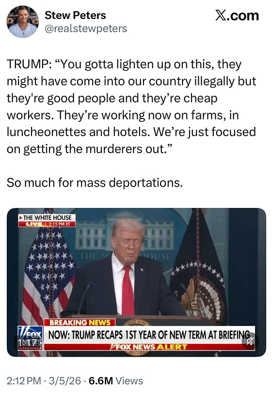 Rightoids will happily tell you that you need to vote Republican in order to get immigration restriction. That this latest foreign policy disaster is something that we need to give Team Babykiller in order to get those deportations. Well, Republicans are going to get BTFO’d in the midterms as a result of this, so this window for deportations is short. Let’s see how that’s going.