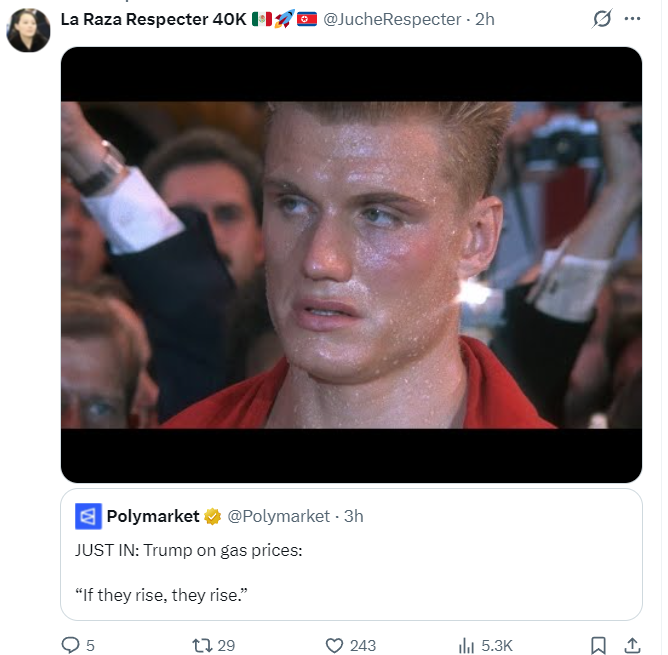 I can’t wait to pay $8/litre at the pump because Trump got caught diddling a child at Epstein Island.
